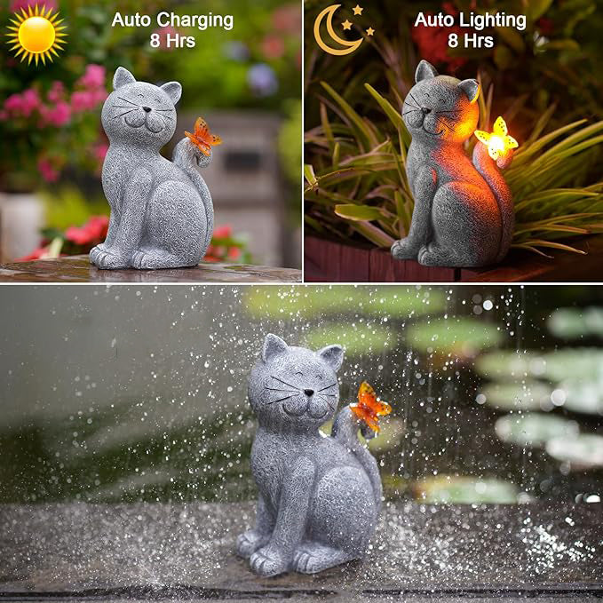 Featuring a sweet cat playing with a butterfly, this statue brings playful charm and peaceful vibes to your garden, patio, balcony, or front porch.