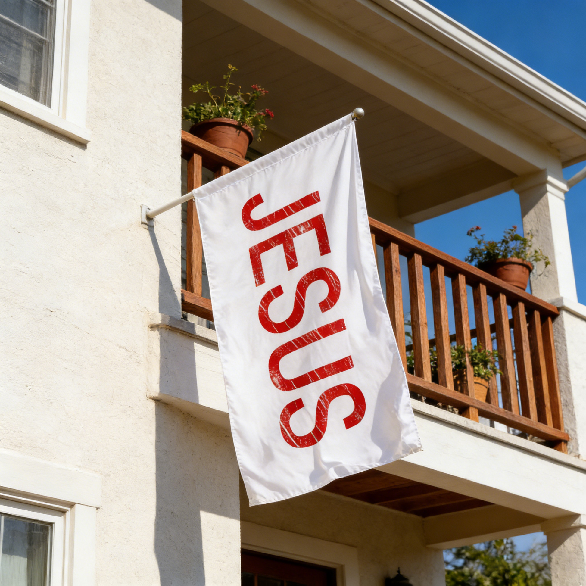 - Eye-catching bold red "JESUS" lettering on premium white polyester fabric